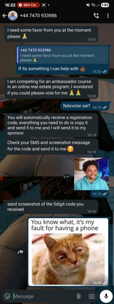 • Then the next thing, they ask you to send them a code sent to your phone